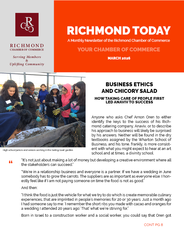 As the voice of business in Richmond, the Richmond Chamber of Commerce connects employers, entrepreneurs, and community leaders to strengthen our local economy. We advocate for a healthy business climate, create meaningful opportunities to connect, and provide resources that help organizations of every size grow, adapt, and succeed—while advancing a vibrant, inclusive future for Richmond.