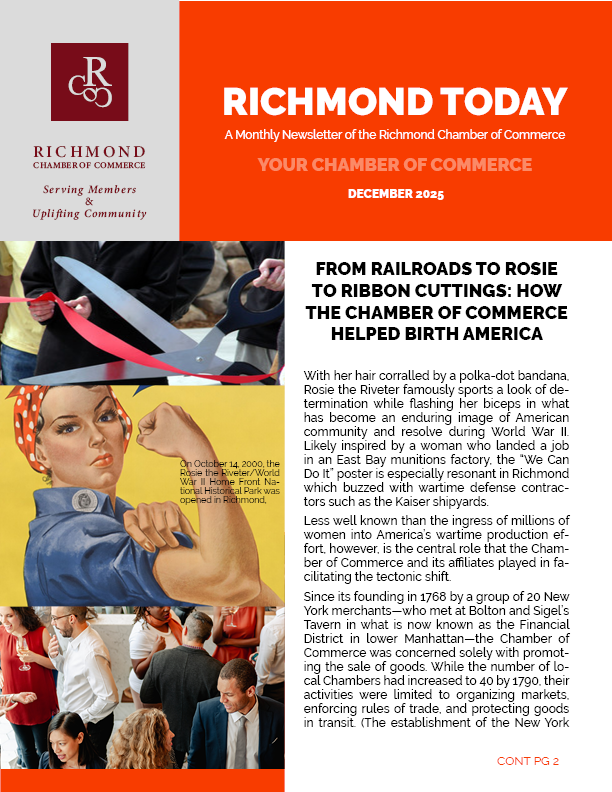As the voice of business in Richmond, the Richmond Chamber of Commerce connects employers, entrepreneurs, and community leaders to strengthen our local economy. We advocate for a healthy business climate, create meaningful opportunities to connect, and provide resources that help organizations of every size grow, adapt, and succeed—while advancing a vibrant, inclusive future for Richmond.